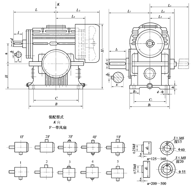 例 蝸桿在蝸輪之下, 中心距為200mm, 公稱傳動(dòng)比為10, 第二種裝配型式, 有風(fēng)扇冷卻的平面